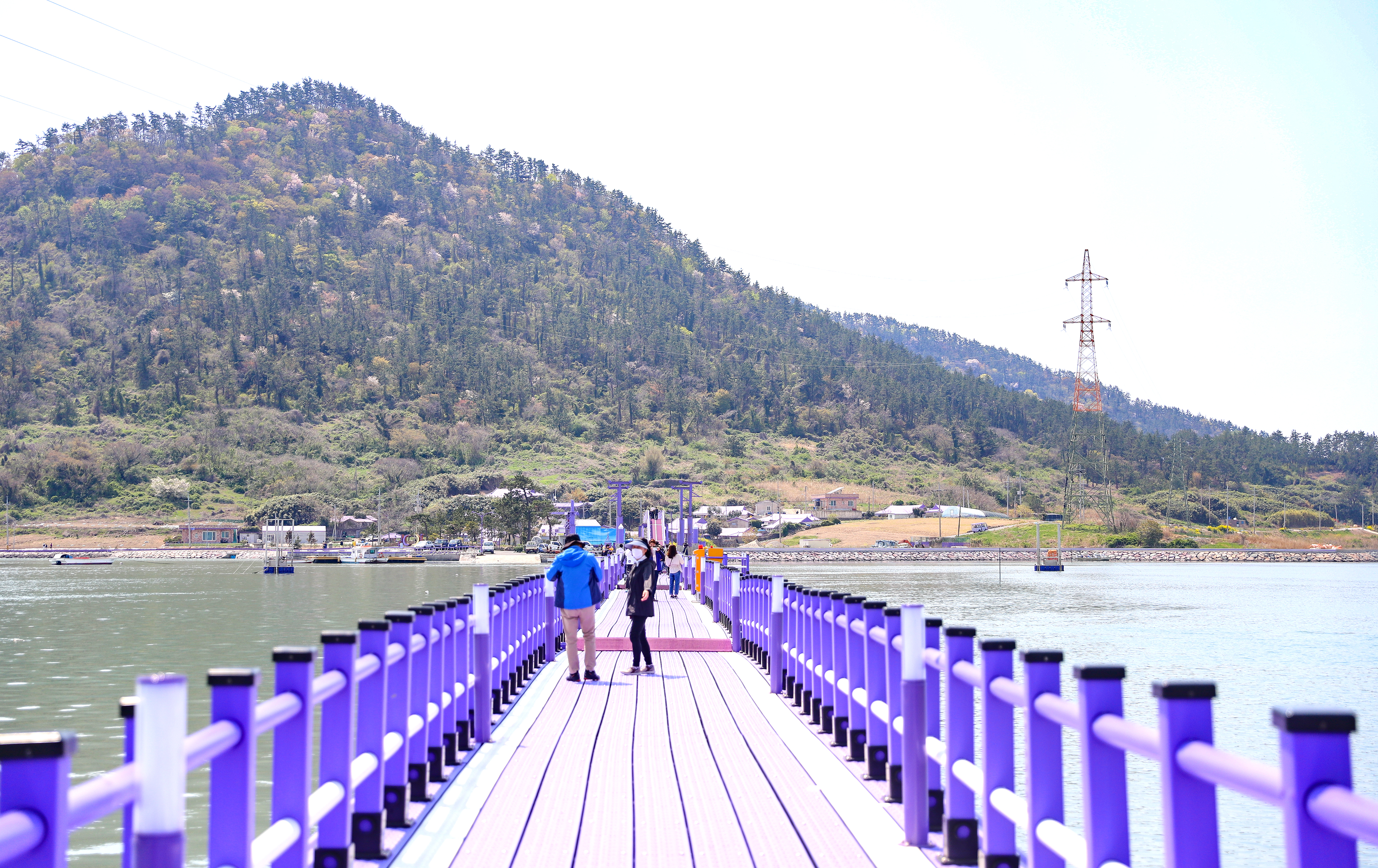 바닷가위의 긴다리부타 마을 지붕색이 모두 보라색인 신안 퍼플섬입니다.